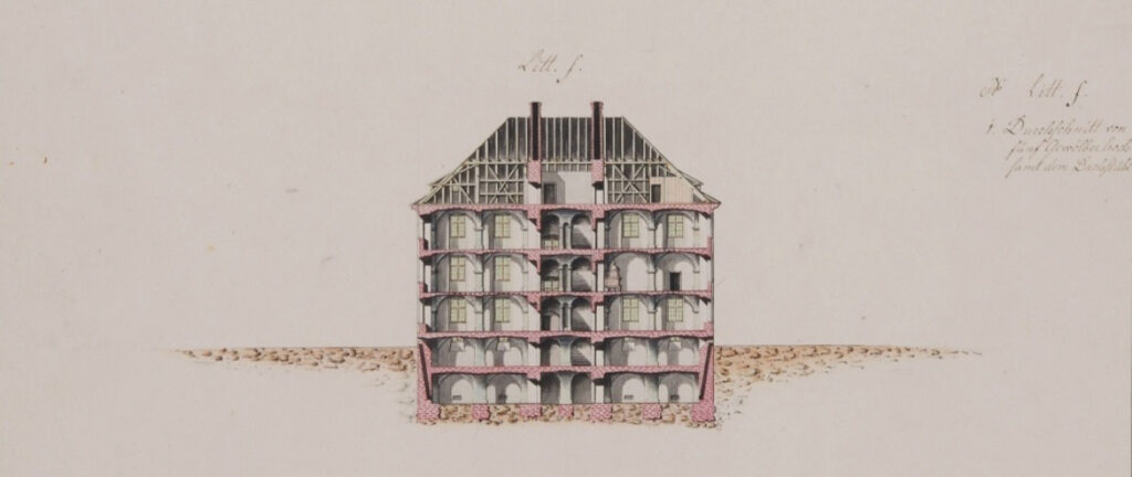 Fürst Josef Wilhelm Ernst beerbte in der ersten Hälfte des 18. Jahrhunderts in relativ schneller Folge all seine Vettern und deren z.T. sehr umfängliche Archive. Die räumlichen Lösungen, die er für das Hauptarchiv in Donaueschingen vorsah, wurden dadurch immer wieder von der Realität überholt. In vierzig Jahren musste das Archiv dreimal umziehen, wobei sich jedes Mal die Ansprüche an die Unterbringung hochschraubten. 1756 wurden schließlich Nägel mit Köpfen gemacht. Verschiedene Lösungen und Pläne wurden dabei von den Architekten vorgelegt und wieder verworfen. Sie waren alle in hohem Maße innovativ und experimentell. Ein Plan sah z.B. eine Dachterrasse mit Balustrade vor, die wohl als Lustgarten der Archivare dienen sollte. Bei einem anderen bildeten die gewölbten Decken der oberen Magazinräume das Dach. Den Architekten ging es darum, den besonders brandgefährdeten hölzernen Dachstuhl zu vermeiden.