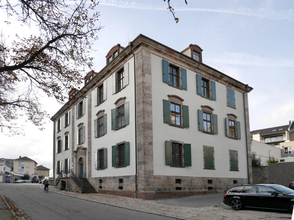 Zum Zuge kam schließlich ein Plan des fürstlichen Baumeisters Franz Joseph Salzmann. Nach Außen präsentiert sich sein Gebäude relativ nüchtern und abweisend. Sockel, Lisenen und Gebäudeecken aus Quaderstein, eine großzügiges Freitreppe und das Portal mit dem schönen Wappengitter sind der einzige Schmuck. Die Fenster sind durch Fenstergitter und eiserne Läden sicher verschlossen.