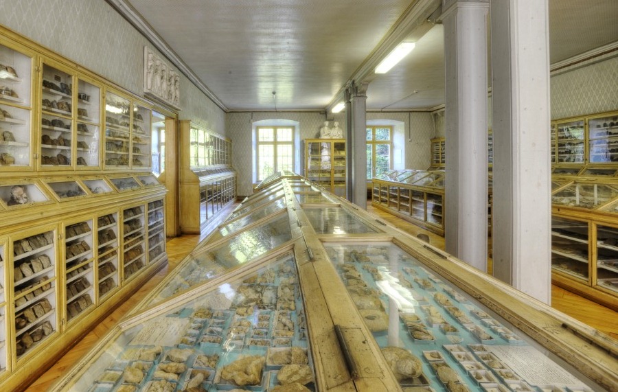 Eine überwältigende Fülle von Fossilien, Mineralien und Gesteinen empfängt den Besucher im Erdgeschoss der F.F. Sammlungen. Die Ausstellung und die Vitrinen stammen aus der Bauzeit des Museums in den späten 1860er Jahren. Die nach heutigen museumsdidaktischen Ansprüchen hoffnungslos veraltete Form der Präsentation wird heute als „Museum im Museum“ bewusst beibehalten. Die überholte Darstellung sollte zudem nicht über den wissenschaftlichen Rang der Exponate hinwegtäuschen.